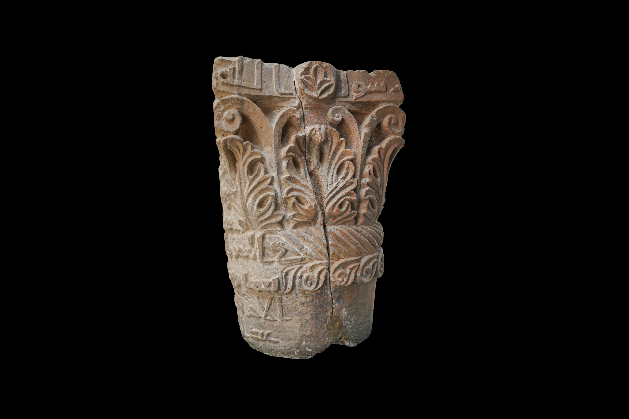 تاجية عمود عليها كتابات عربية. زيّنت ثلاث أوجه بصف من أوراق الأكانثوس، يفصل بينها حلى حلزونية مزدوجة. يحتوي أحد الجوانب على كتابة عربية نافرة على خلفية مسطحة: “بسم الله الرحمن الرحيم، أمر ببناء هذه البركة عبد الله يزيد أمير المؤمنين أصلحه الله وحفظه ومد له العمر والسرور، أتم عليه نعمه وكرامته في الدنيا والآخرة، بنيت على يد عبد الله بن سليمان”. وهناك نص آخر يحيط بطبلية التاجية على أحد الجوانب الثلاث المزخرفة ويقطعه في المنتصف زخرف بارز لثلاث أوراق: “اللهم صلي على عبدك رسول الله”. بين السطرين الثامن والتاسع من النص الأول حفرت ثلاث كلمات بحروف صغيرة: “خمسة عشرة ذراع”.