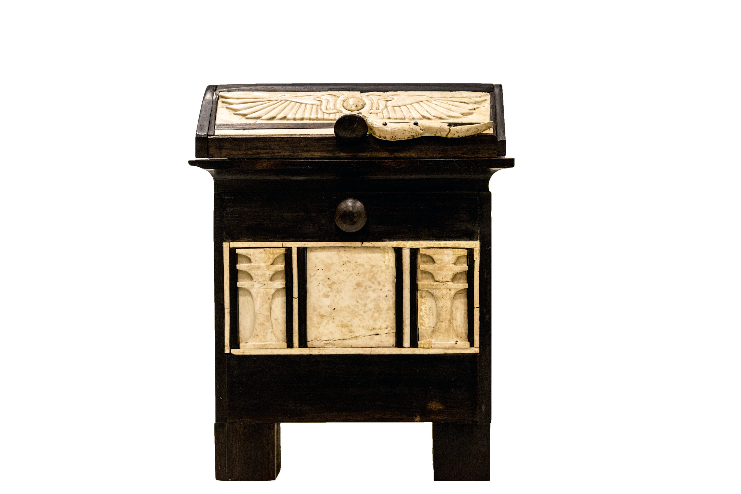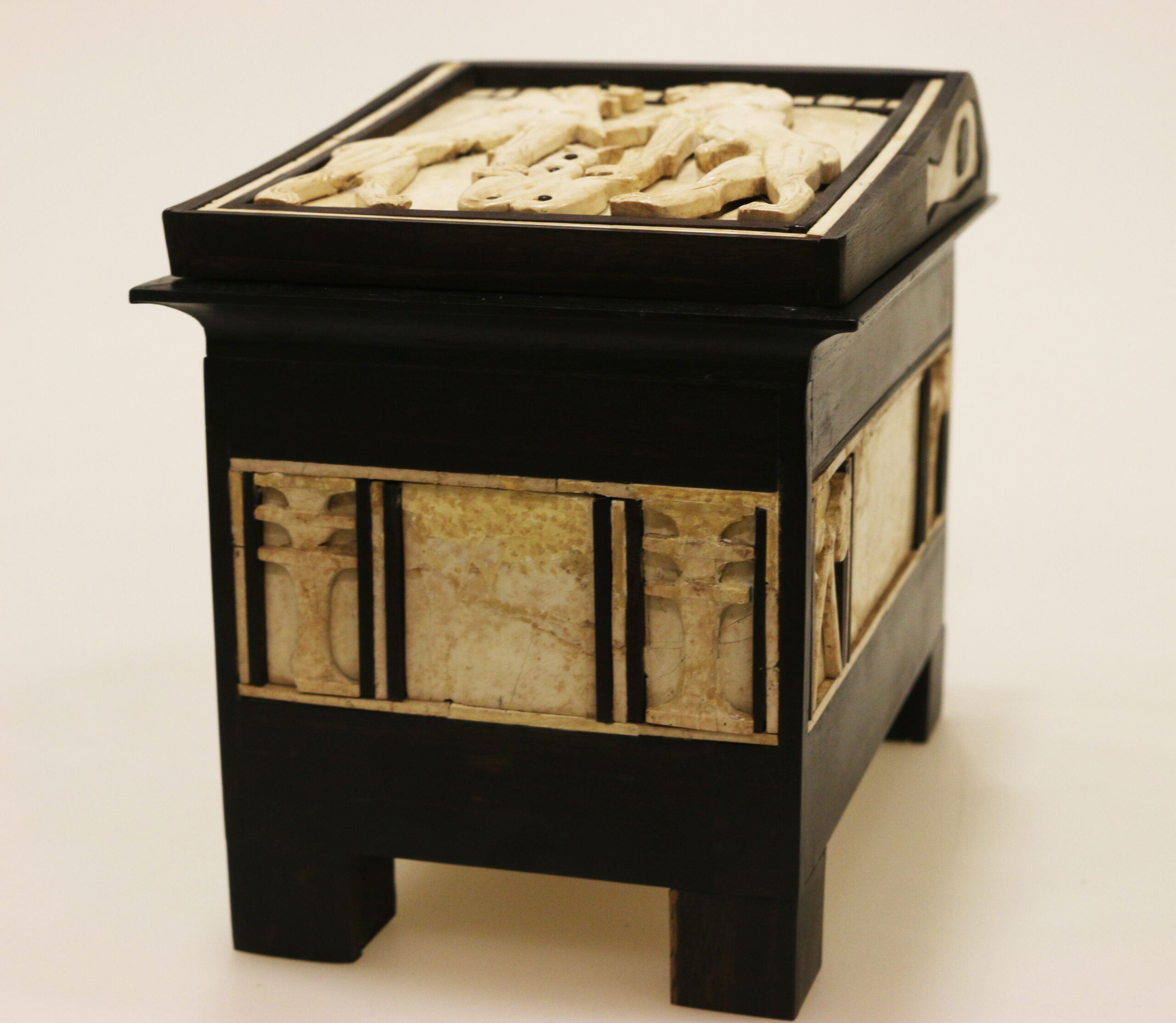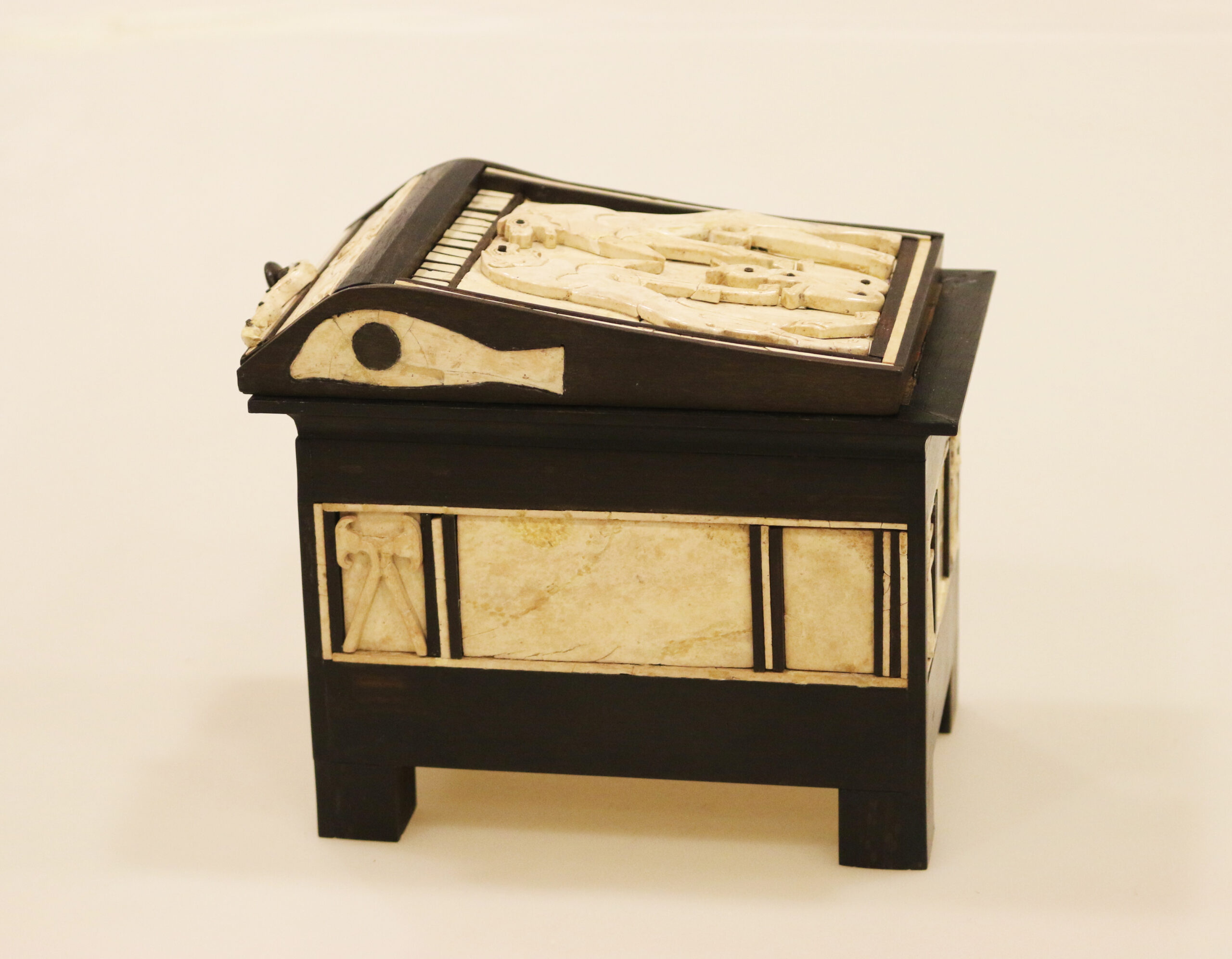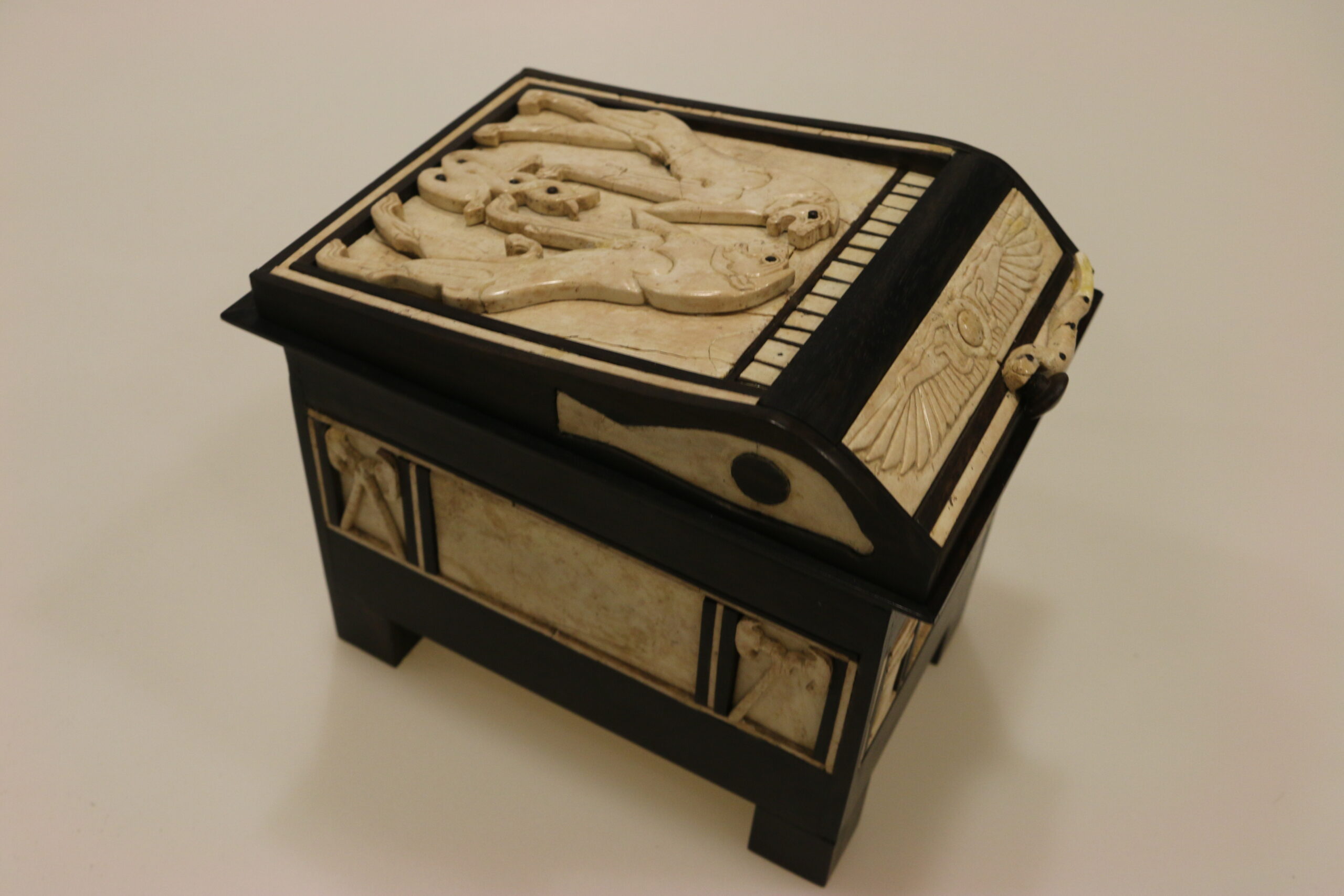 كان الخشب الذي صنع منه هذا الصندوق على الأغلب من الأبنوس، وكان قد تحلل بفعل الزمن لكن أعيد تركيبة استناداً إلى مواضع القطع العاجية عند اكتشافها وبالمقارنة مع الصناديق المصرية المعاصرة، وقد أوحت الصور المرسومة على الصندوق بهذه المقارنة مع مصر.
